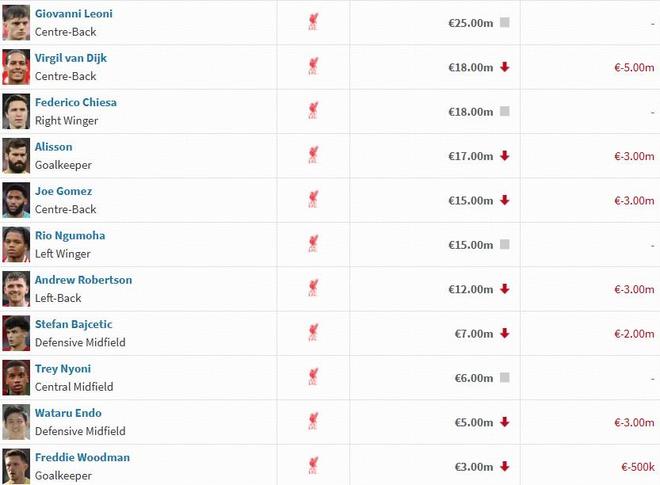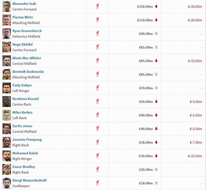 利物浦球员身价变动:伊萨克维尔茨下跌2000万欧,萨拉赫下跌1500万欧